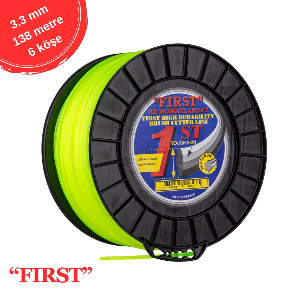 FIRST 3.3 mm 138 metre 6 köşe tırpan misinası, yoğun ot temizliği ve geniş alan bakım çalışmalarında yüksek kesim performansı sunmak üzere geliştirilmiş profesyonel sınıf altı köşeli kesit yapısına sahip tırpan misinasıdır. Özel profil tasarımı sayesinde sert ve lifli yabani otlarda hızlı ve temiz kesim sağlar.