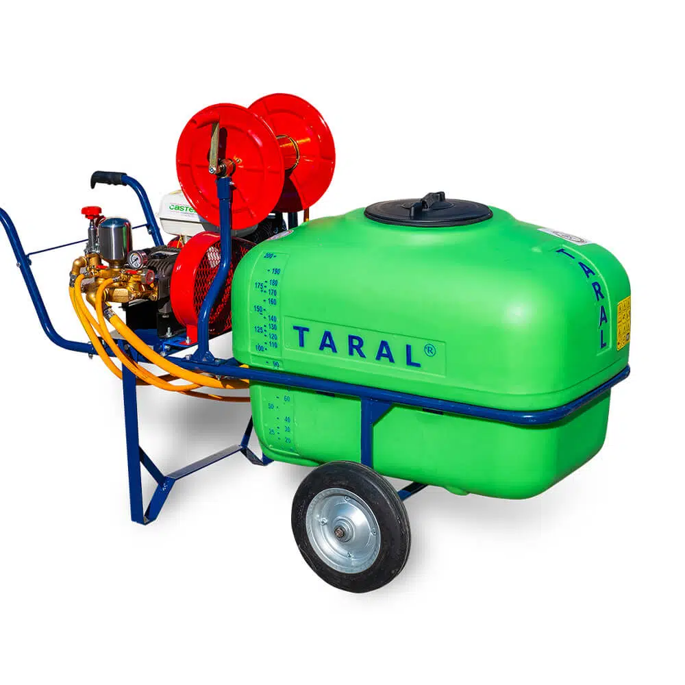 3 katmandan oluşan 200 litre deposu dayanıklı malzemeden üretilmiştir ve dış kışmı UV ışınlarına karşı, iç kısmı yosunlaşmaya karşı özel kaplamaya sahiptir. Depo giriş ve çıkış noktalarında tıkanma önleyici özel filtreler mevcuttur. Çelik şaseli kataforez kaplamalı gövde ve toprakta hareket kolaylığı sağlayan kauçuk dolgu tekerlere sahiptir. 4 çıkışlı regülatörün 2 çıkışı hortum tabancalarına gider. Bu sayede aynı anda 2 kişi ilaçlama yapabilir. Redüktör şanzıman mevcuttur ve hortum sarma makarasına 200 metreye kadar hortum sarılabilir. Farklı motor ve pompa seçenekleriyle sunulmaktadır.